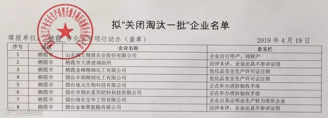 栖霞拟“关闭淘汰一批”(第一批)化工生产企业名单(8家)