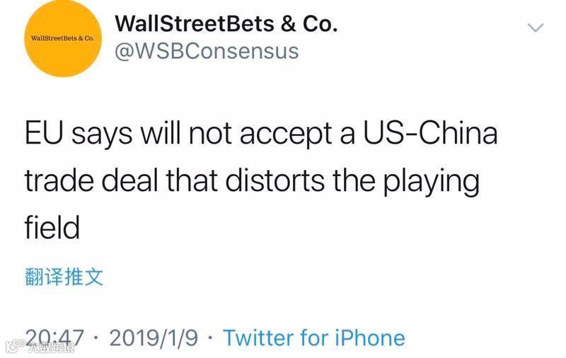 欧盟已经发声,中美谈判扭曲市场伤害欧盟,因为中国市场给了美国,欧盟就少了。