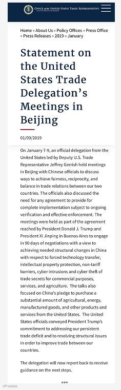 1月7日至9日,由美国副贸易代表杰弗里·格里什(Jeffrey Gerrish)率领的美国官方代表团在北京与中国官员举行了会谈,讨论如何在两国贸易关系中实现公平、互惠和平衡。官员们还讨论了全面落实各项协议的必要性,对落实情况必须不断核查和有效地强制执行。此次会谈是总统和主席在布宜诺斯艾利斯达成的共识的一部分,两位领导人同意在90天内谈判,以实现中国在强制技术转让、知识产权保护、非关税壁垒、网络攻击和出于商业目的的网络窃取商业机密、服务业、农业这些问题上必要的结构性转变。会谈还重点讨论了中国对于从美国购买大量农产品、能源、制成品以及其他产品和服务的承诺。美国官员转达了特朗普总统对于解决我们持续存在的贸易赤字和结构性问题以改善两国贸易的决心。