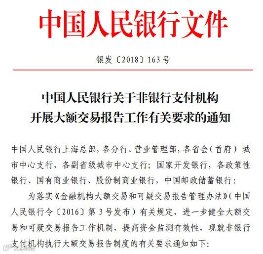 2018年6月26日,央行发布了《中国人民银行关于非银行支付机构开展大额交易报告工作有关要求的通知》(银发〔2018〕163号)。
