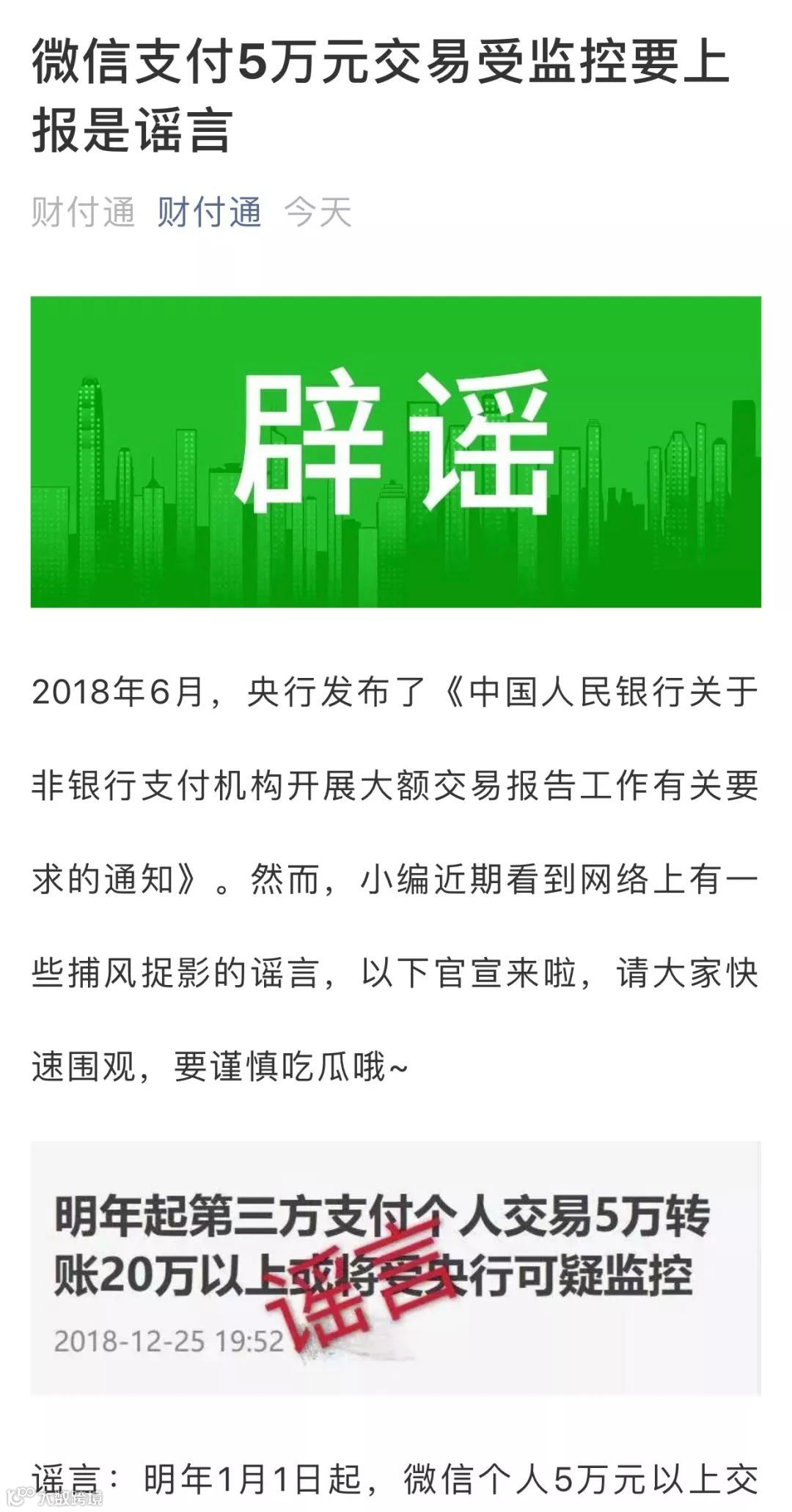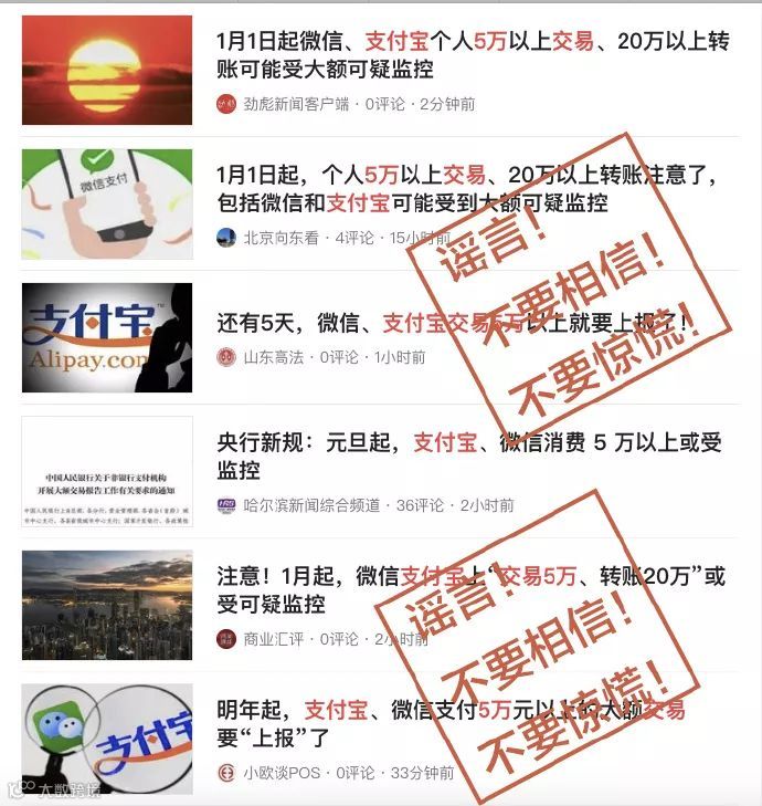 近日,一则“1月起第三方支付个人交易5万、转账20万以上或受监控”的消息在市场流传。对此,支付宝、腾讯财付通相继发布消息称,此信息为谣言。