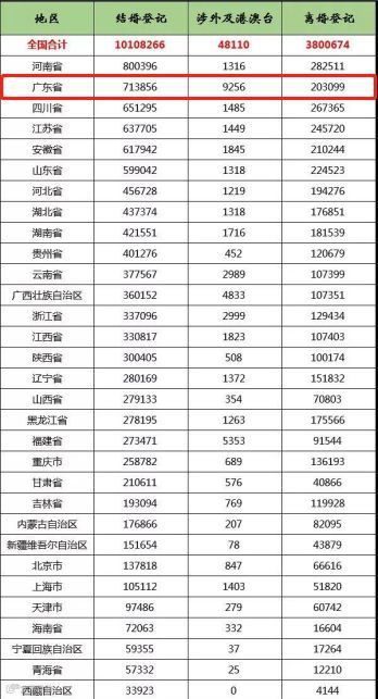 因为广东省的离婚人数位列全国第6位