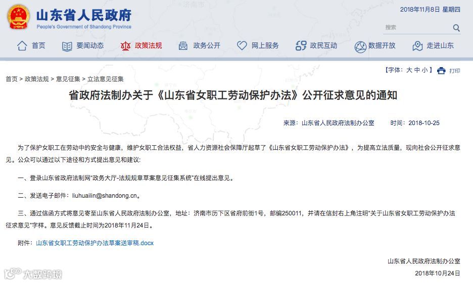 据法制日报报道,《办法》称,为了保护女职工在劳动中的安全与健康,维护女职工合法权益,根据《中华人民共和国劳动法》《女职工劳动保护特别规定》等法律、法规,结合山东本省实际,制定本办法。