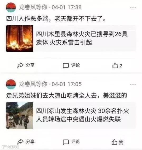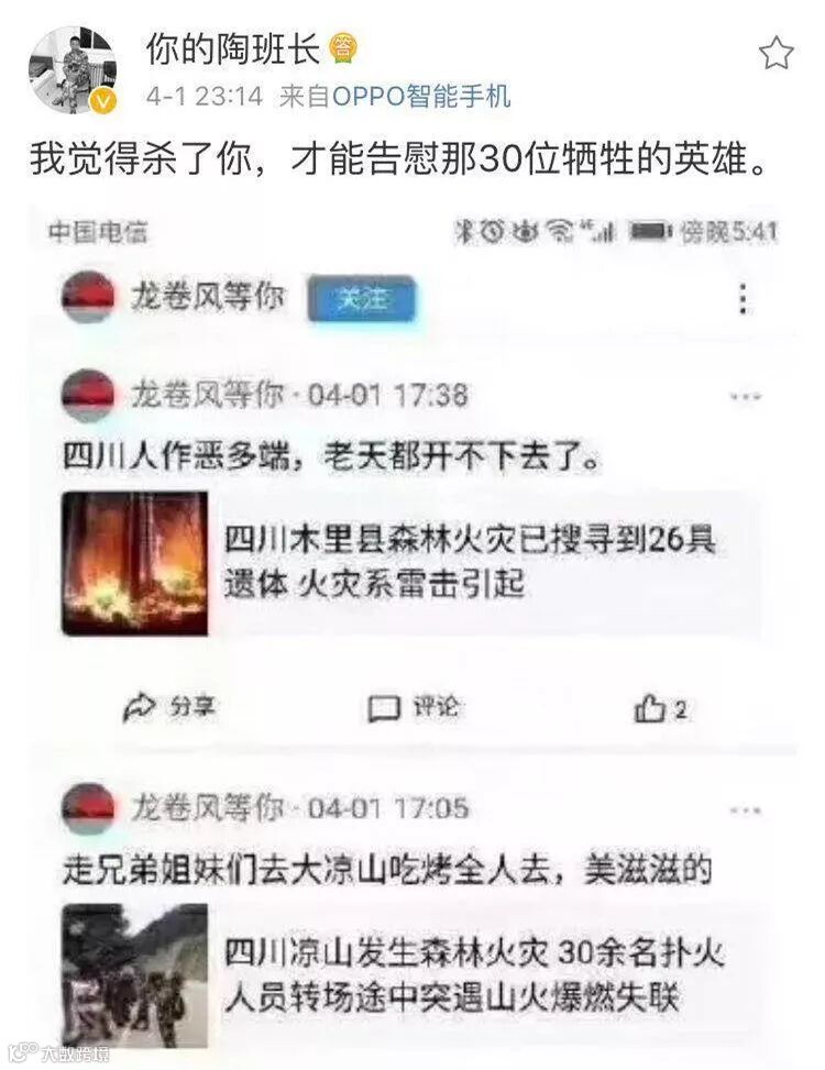 这个网名叫做“龙卷风等你”的人渣,先是用无比恶劣、恶毒,令人作呕的方式,侮辱了凉山牺牲的烈士,然后又对于另外一起新闻做出了同样恶心的评价,令人叹为观止。