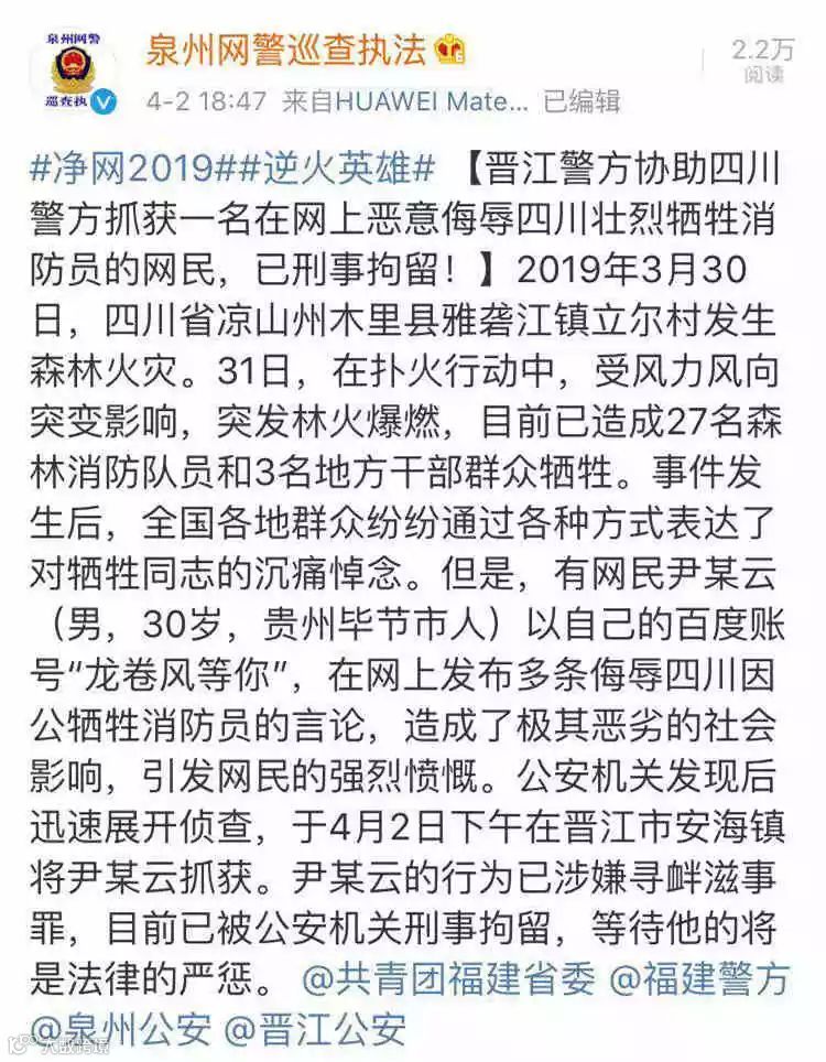 就在刚刚,泉州网警发布微博:侮辱烈士的男子已在晋江落网,被刑拘!