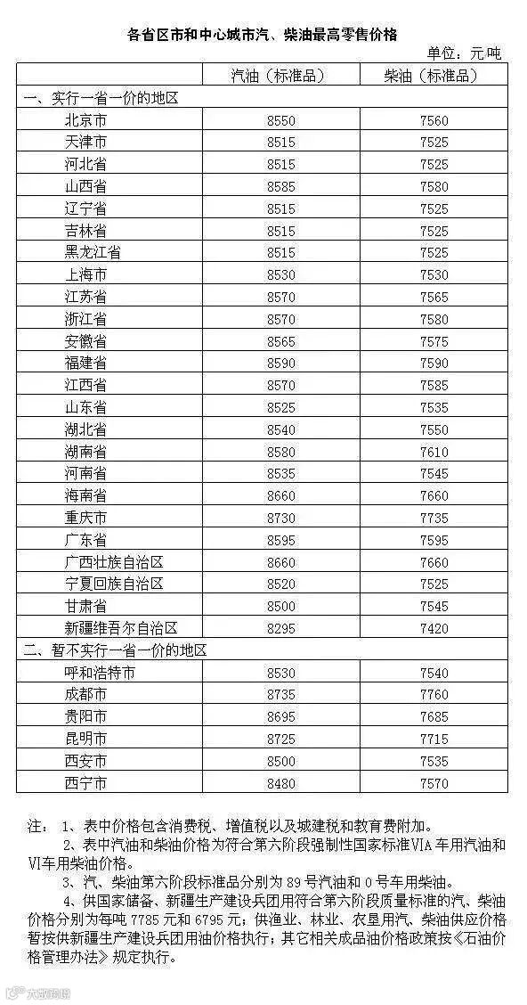 调整后各省(区、市)和中心城市汽、柴油最高零售价格: