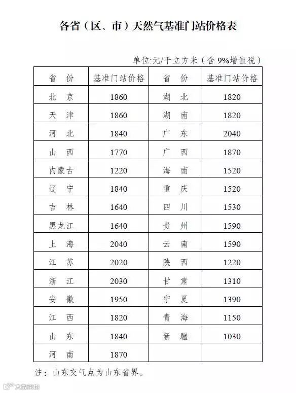 调整后各省(区、市)天然气基准门站价格: