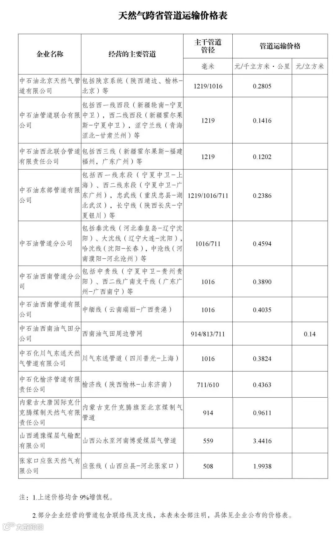 调整后13家跨省管道运输企业管道运输价格: