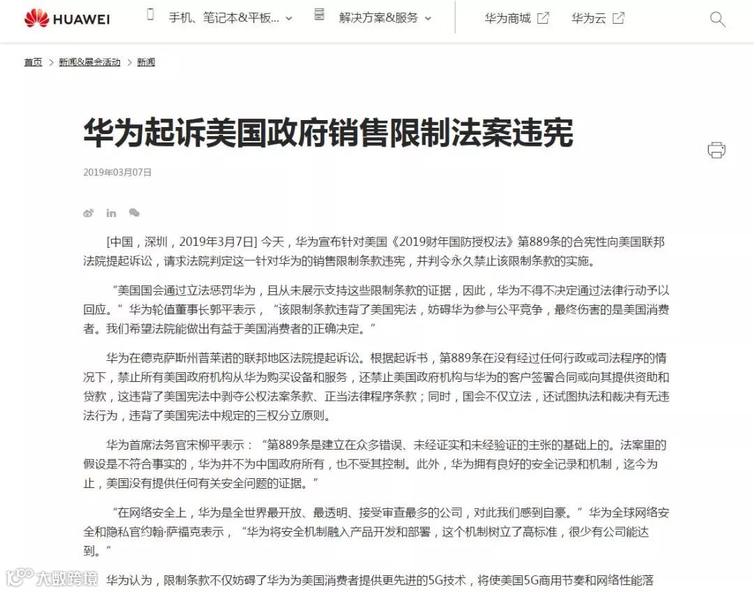 声明称,华为将针对美国《2019财年国防授权法》第889条的合宪性向美国联邦法院提起诉讼,请求法院判定这一针对华为的销售限制条款违宪,并判令永久禁止该限制条款的实施。