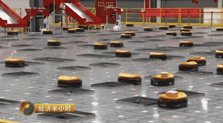 在京东的一个分拣车间里,有300个机器人正在分拣,单小时处理能力达到12000件。