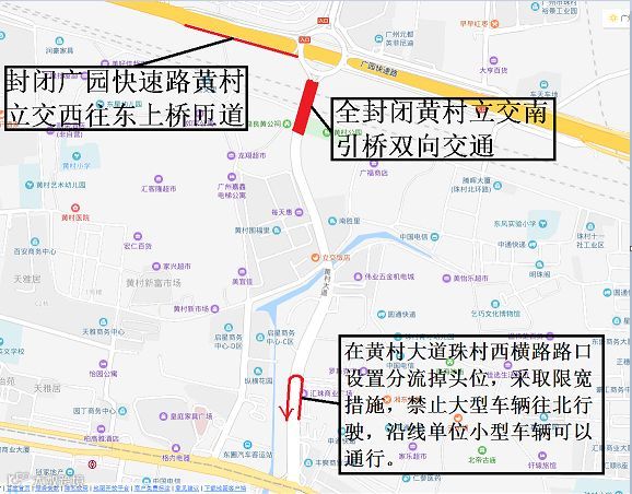 1.全封闭黄村立交南引桥双向交通、广园快速路黄村立交西往东上桥匝道;