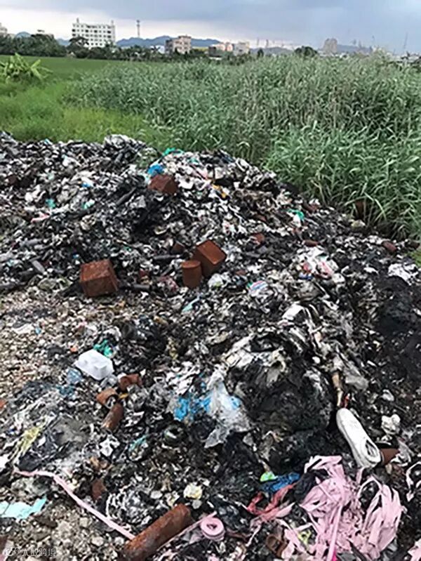 利用当地镇领导安排找铁锨的功夫,督察组一行来到李仙村一片水稻田旁,从电子垃圾、女士内衣加工废料到焚烧过的工业垃圾和生活垃圾,应有尽有。督察组无语。