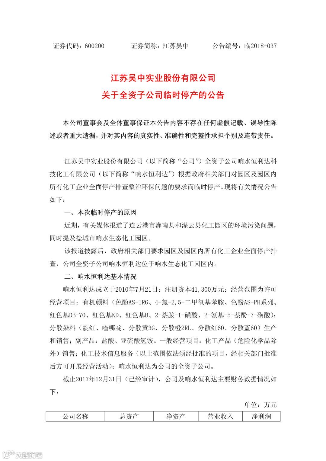 响水恒利达所涉及到的产品为:有机颜料(色酚AS-IRG、 4-氯-2,5-二甲氧基苯胺、色酚AS-PH系列、红色基DB-70、红色基KD、红色基B、 2-萘胺-1-磺酸、 2-氨基-5-萘酚-7-磺酸);分散染料(靛红、喹哪啶、分散黄3G、分散橙2RL、分散红60、分散蓝60)生产和销售;副产品:盐酸、亚硫酸氢铵。