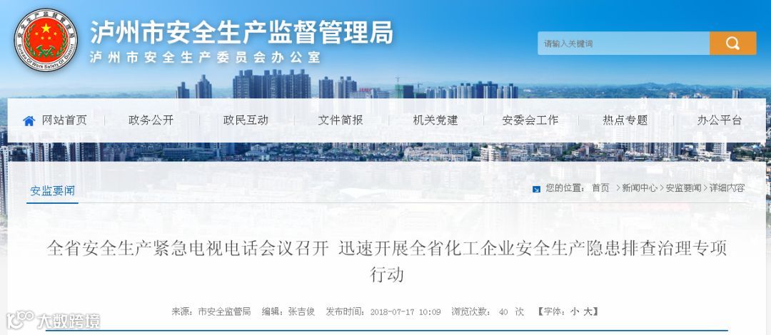 相比宜宾市泸州市危化品生产经营企业规模更大、数量更多,全市危化品生产经营企业达500多家,重大危险源32个,形势更严峻。泸州市、县督查一律暗查暗访,尤其是危化企业要全方位全覆盖再排查。