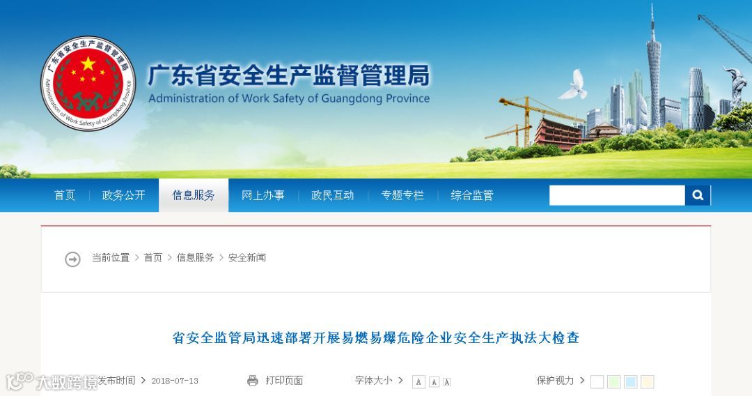 7月13日,广东省安全监管局迅速部署开展易燃易爆危险企业安全生产执法大检查,省安全监管局立即部署从即日起至2018年7月31日在全省开展易燃易爆危险企业安全生产执法大检查,重点检查化工园区和涉及“两重点一重大”尤其是硝化、磺化、胺基化、氯化、氨化、聚合等企业,涉及遇湿或高温容易分解出易燃、有毒气体的原材料和产品的企业以及属于红色风险等级的企业,严查生产、储存等各个环节的各类重大事故隐患和违法违规行为。组织5个检查组对广州、珠海、惠州等10个重点地区进行检查。