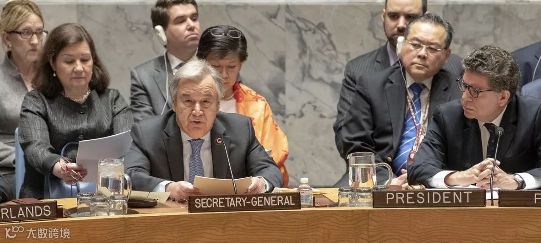 联合国秘书长古特雷斯在安理会就美英法空袭叙利亚召开的紧急会议上做情况通报。图片来源:联合国安理会网站