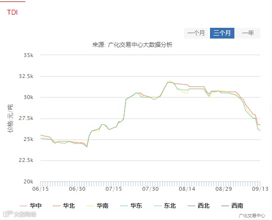 TDI涨破XXX一直是出场率很高的话题,今年8月份上旬,国内TDI出厂价涨破32500元/吨,进入旺季以后,万万没想到啊!TDI反而跌了,连续跌破30000元/吨、27500元/吨两大关口,跌的下游企业们估计得抱团哭了,后期估计还有的跌!