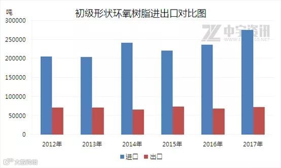 近年来我国环氧树脂行业发展显著提速,2012-2017年国内产能呈现出递增的局面。据中宇资讯监测,2012-2017年国内环氧树脂对外依存度平均维持在20%附近。据中宇资讯不完全统计,截至2017年国内环氧树脂产能近230万吨,产量至122万吨附近。国内的环氧树脂产品多以中低端为主,技术含量较高的复合材料用环氧树脂需要仍然依赖进口。