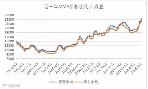 据了解,近期国内MMA(甲基丙烯酸甲酯)市场价格延续积极攀涨运行走势,整体供应层面异常偏紧背景下,国内各大生产企业纷纷高报惜售,近期国内甲基丙烯酸甲酯主流市场成交价格高位攀涨至25300-25500元/吨,部分地区高端成交价格已经盘整至26000元/吨,华东市场主流商谈在24500-25000元/吨,华南市场主流商谈25000-25500元/吨,市场价格再创历史新高。
