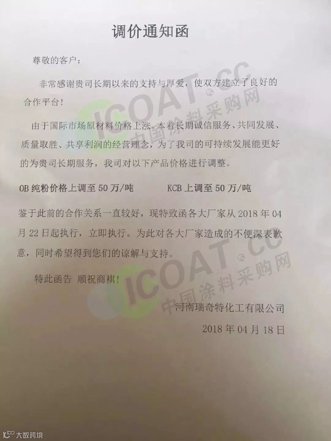 亨斯迈公司发出通告因生产成本增加,只能将部分增加的成本分摊到客户方面,否则生产将无法继续。索性直接涨价!涨价后新的价格政策于2018年4月8日生效。据统计,四月份宣布涨价的化工巨头包括但不限于:巴斯夫、科莱恩、伊斯曼、关西涂料、阿克苏诺贝尔、立邦、艾仕得、阿科玛、利安德巴塞尔。