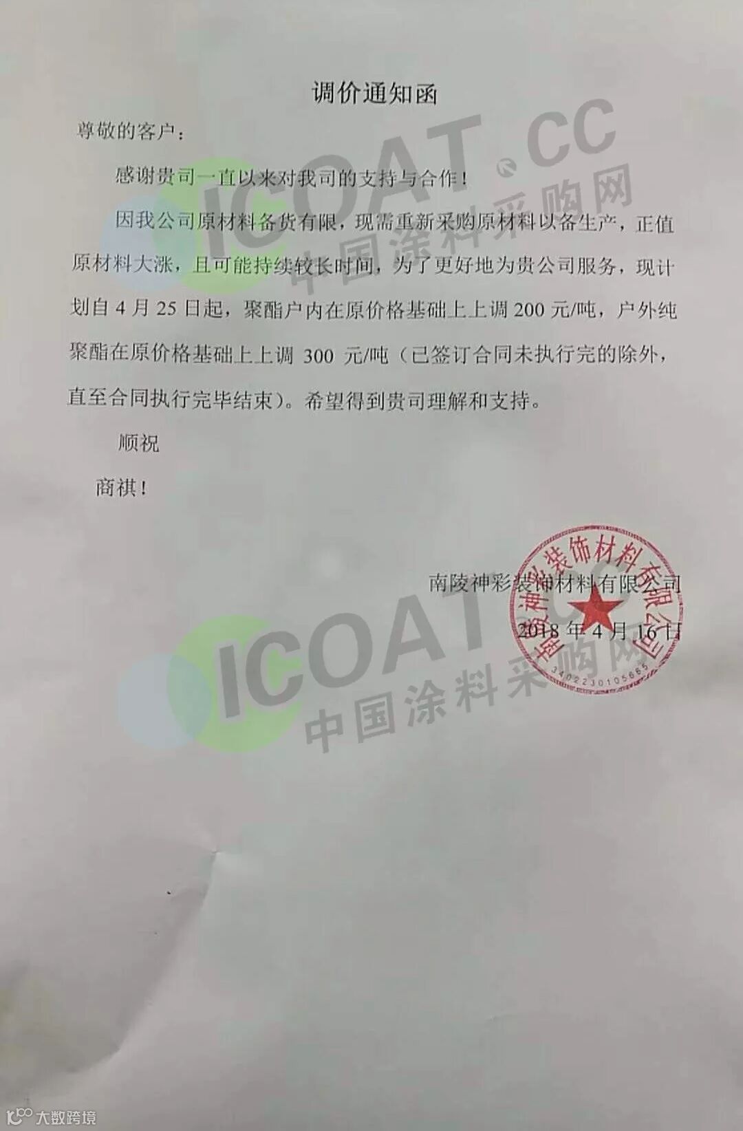 国内南陵神彩装饰材料有限公司宣布,因原材料备货有限,现需重新采购原材料以备生产,正值原材料大涨,且可能持续较长时间,计划自4月25日起,聚酯户内在原价格基础上上调200元/吨,户外纯聚酯在原价格基础上上调300元/吨。
