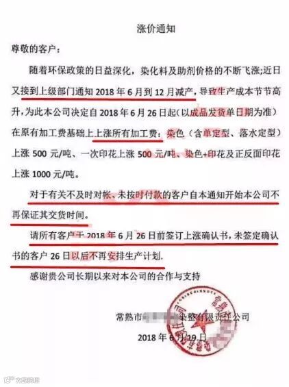 6月19日,江苏常熟一印染企业发出涨价通知:随着环保政策的日益深化,染化料及助剂的不断飞涨;近日又接到上级部门通知6月到12月减产,导致生产成本节节高升,为此本公司决定自2018年6月26日起(以成品发货单日期为准)在原有加工费基础上上涨所有加工费。