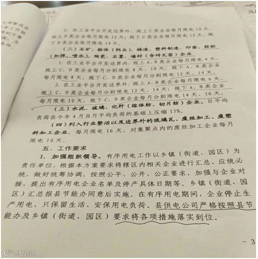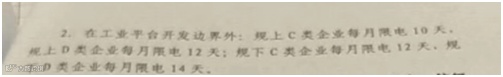 2、在工业平台开发边界外:规上C类企业每月限电10天、规上D类企业每月限电12天;规下C类企业每月限电12天,规下D类企业每月限电14天;