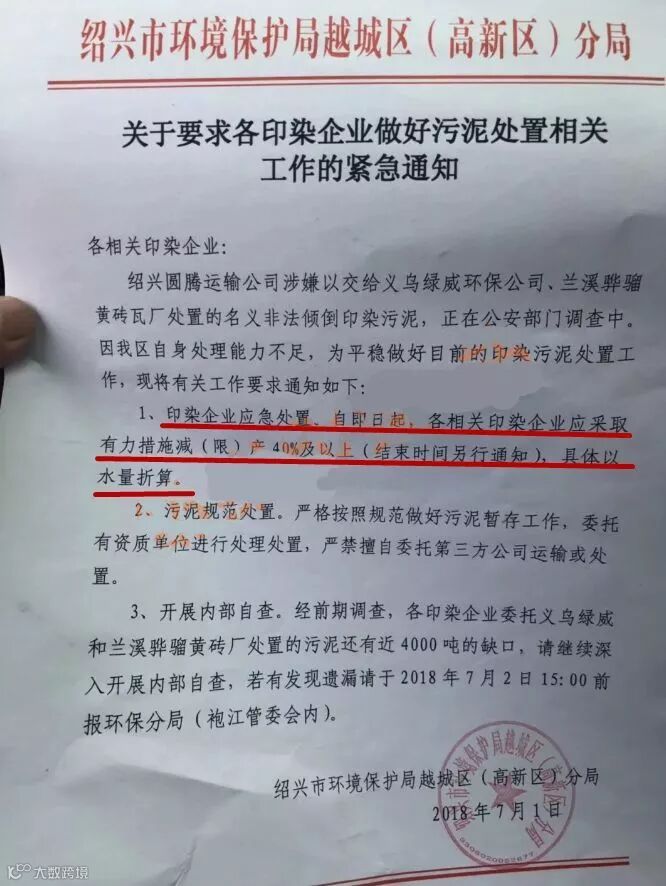 据网友爆料,因绍兴圆腾运输公司非法倾倒印染污泥,造成区内印染企业近4000吨的印染污泥缺口,越城区自身处理能力不足,故即日起要求区内印染企业减(限)产40%以上,结束时间另行通知。