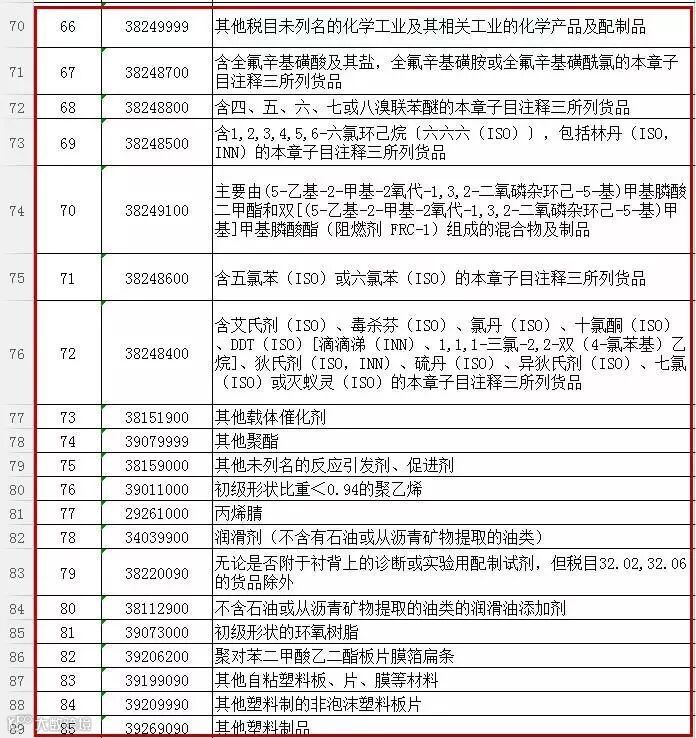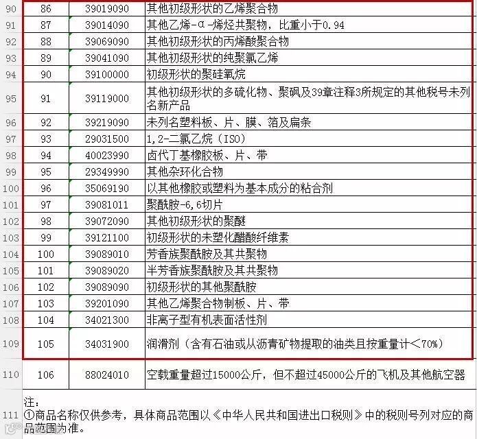 清单包括化学制品、药品、橡胶制品、金属制品、不锈钢产品、铝合金产品、涡轮喷气产品、发光二极管、摩托车和牙医设备等。
