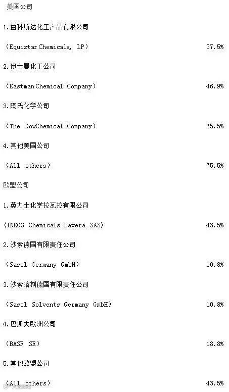商务部裁定,在本次复审调查期内,被调查产品存在倾销。根据《中华人民共和国反倾销条例》的有关规定,国务院关税税则委员会决定,自2018年4月12日起,对原产于美国和欧盟的进口乙二醇和二甘醇的单丁醚按以下税率征收反倾销税: