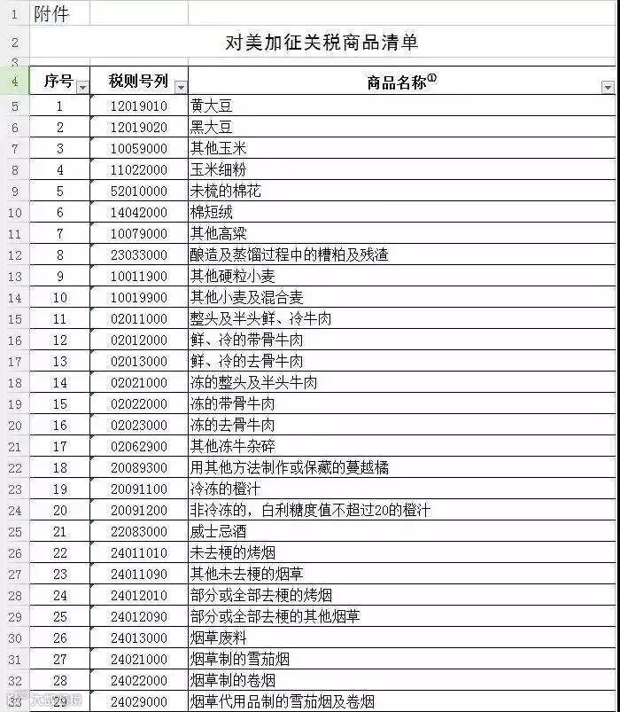 一、加征关税的商品为大豆、汽车、化工品等14类106项商品。征税范围详见附表。