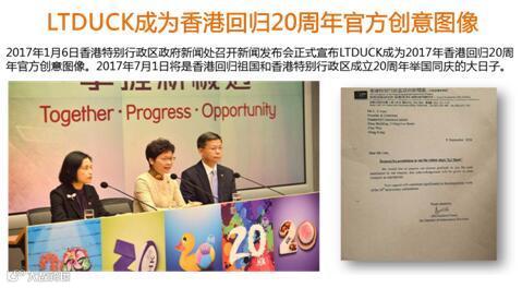 2017年7月1日将是香港回归祖国和香港特别行政区成立二十周年的大日子,也是一个重要的里程碑,意义重大。为了与大家分享回归二十周年的喜悦,2017年1月6日香港特别行政区政府新闻处召开新闻发布会正式宣布LTDUCK成为2017年香港回归20周年官方创意图像。