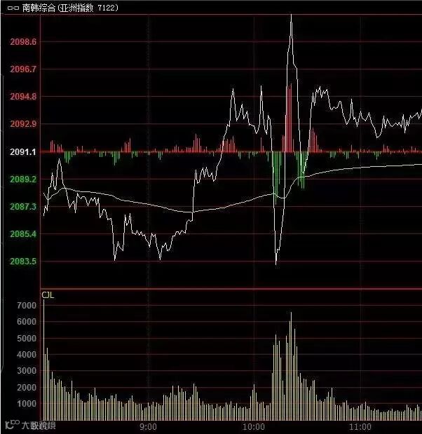 当天韩国KOSPI指数早盘在2083点附近低位波动,朴槿惠总统弹劾案结果宣布前冲高至2095点附近。韩宪法法院开庭后,股指出现一波快速跳水,回跌至日内低点2083附近,随后股指再次反弹。