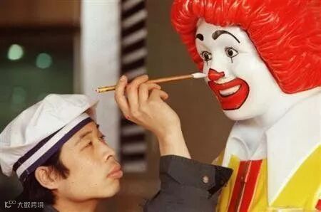 1997年12月22日,北京,工人为“麦当劳叔叔”上色。麦当劳连锁快餐于1990在深圳开设第一家门店,随后在中国迅速扩张。