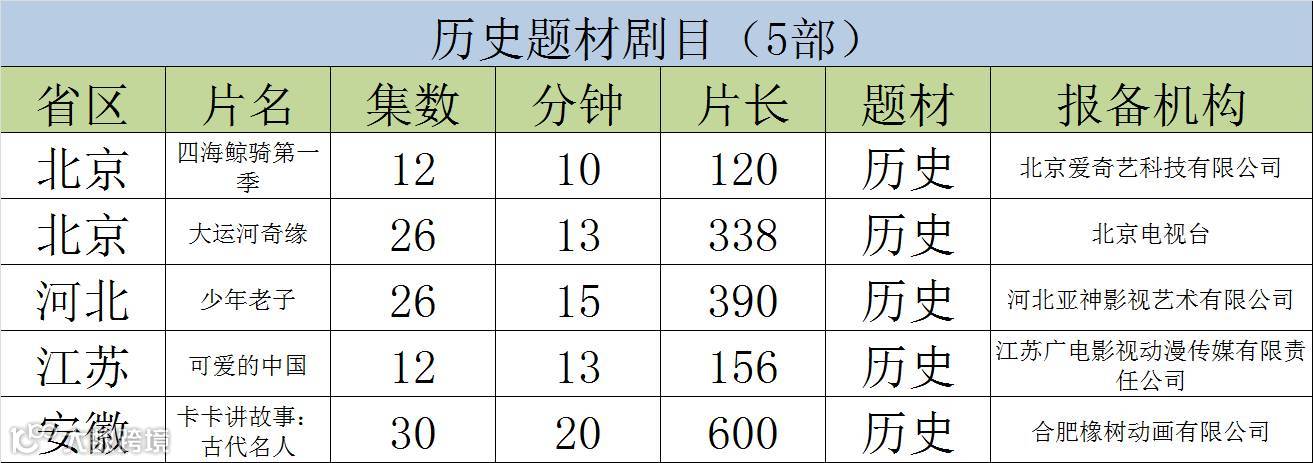 历史题材5部、1604分钟,占备案公示总数的20.8%、24.2%。
