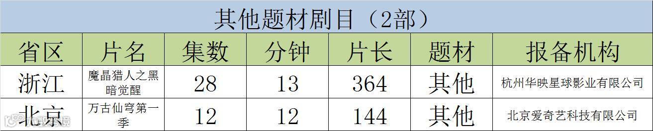 其他题材2部、508分钟,占备案公示总数的8.3%、7.7%。