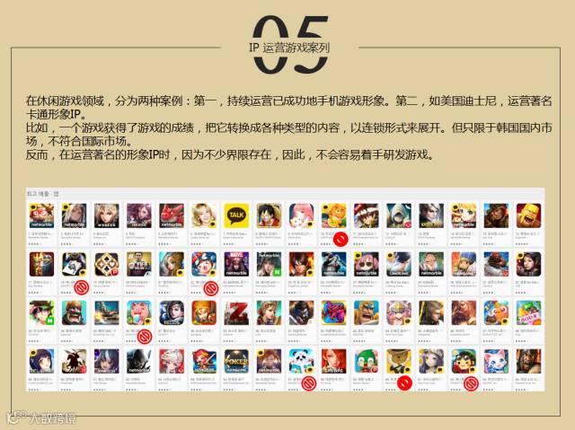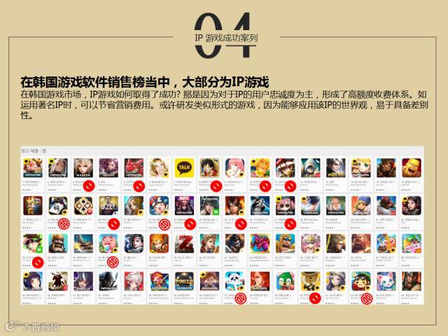 韩国游戏的项目越来越与IP接近,我们现在看到的画面红色的圆圈,其实也是游戏本身上市的方式,在国内也取得了比较好的成绩。中国有比较成功的手机游戏,比如传奇、穿越火线在国内算比较好的,原有的动漫和IP合作也不少,最近也有中国的游戏公司,叫三七游戏的拳皇,这也是比较成功的项目之一。