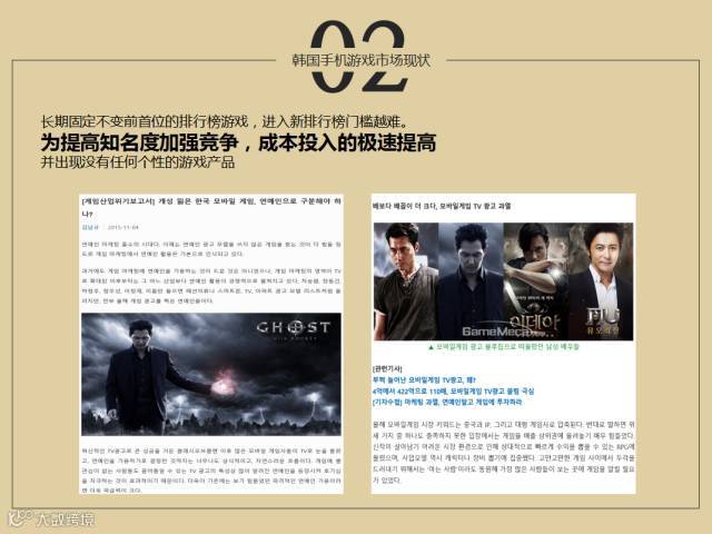 第二韩国游戏的特征,因为竞争比较激烈,因为要提升知名度,所以越来越新的项目在成本方面也投入的比较大。首先这一些游戏排行门槛比较高,所以前期营销推广投入了很多的资金,这个资金用在电视广告、公交车、地铁,无数的费用投入在了这些平台上面,整体的情况也不是特别好,这一些年,尤其近期,韩国的媒体界特别关注韩国游戏市场的竞争状态,所以这一些游戏投资报告上面,游戏产业韩国已经遇到了很大的危机感,大家都是盲目的投入,基本上很多专业研究领域的报告,说韩国已经失去了个性化的游戏趋势,报告上面也有危机感,左、右两边的画面是我们韩国媒体界最近报道的比较差的案例。
