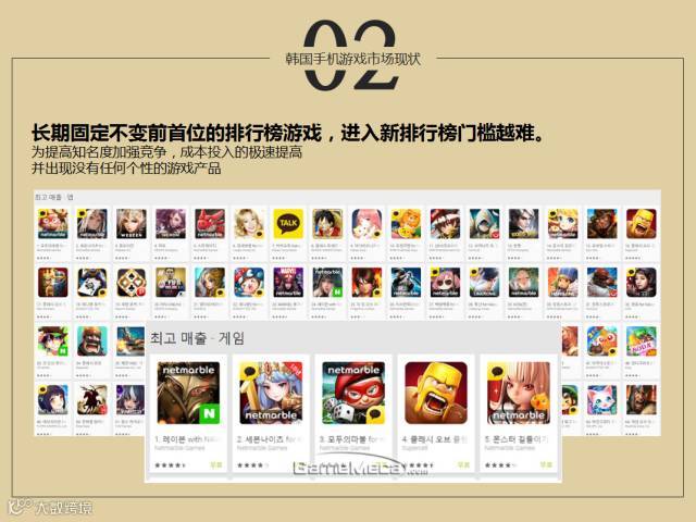 首先韩国的游戏市场有三个趋势可以说明,第一个,目前韩国的游戏市场情况也是长期固定的,第一到第一百的顺序也是变化特别小的,所以进入新的排行门槛是越来越难。我们在画面上看到的最中间的,也是去年4月份排行榜的数据,目前的排行和去年的排行相差不大,所以这也是参考画面。因为排行不变的情况有几个原因,是因为游戏玩家已经熟悉了自己玩的游戏,自己长期玩,对于游戏开发公司来说,因为做一个新游戏要投入很大的成本,所以想到这个问题上,还是保持原先的游戏去上市;