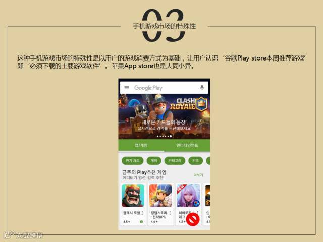今天给大家介绍的韩国游戏情况是这样的,韩国和中国市场有比较大的差异,目前在韩国的游戏界,通过我们谷歌和安卓商店做推广游戏,而且可以说在韩国市场占了70%的份额,所以实际上韩国和中国有很大差异,运营商店里有几百个游戏,今天主要讲的是韩国手游上线平台,以谷歌为主,通过谷歌的排行来看,可以分析目前的情况。