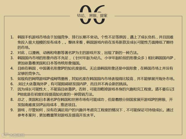 总体分析下来,韩国手游市场和中国手游市场合作游戏的话,国内的IP各方面还是有薄弱的影响力,针对目前的情况,不管对于韩国市场还是中国的市场,如果去上市的话还是比较困难的,IP结合的话,跟西方或者先进的IP合作,会更好一点。