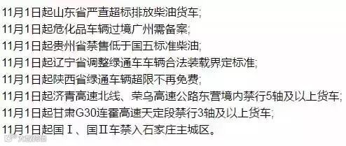 从2017年11月份起,山东、广东、贵州、辽宁、河北、陕西、甘肃等省出台新规,严查柴油车超标排放、调整绿通车车辆合法装载界定标准,增加禁行范围。