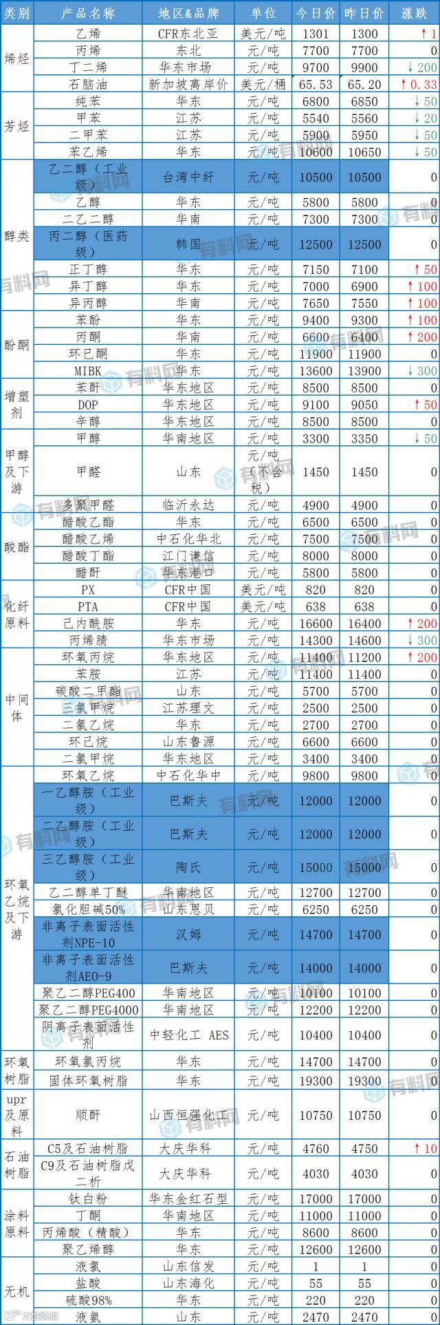 【化工报价】11月29日主要化工产品涨跌定价