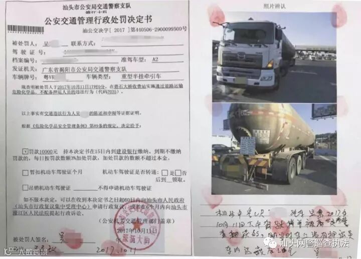 10月11日17时许,交警濠江大队依托交警查缉平台,在交警执法站查获一辆车牌号码为粤VR3***的危运车。该车运转天然气没有随车配备安全押运员,在礐石大桥收费站被民警当场查获。驾驶员吴某对其违法行为供认不讳。