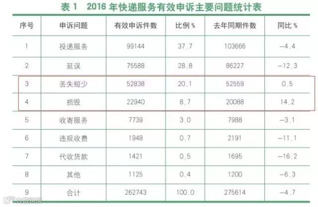 根据国家邮政局发布的2016年度快递市场监管报告,2016年快递服务有效申诉262743件,同比下降4.7%,在其它申诉项目均同比下降的情况下,丢失短少申诉同比增长0.5%,损毁申诉同比增长14.2%。