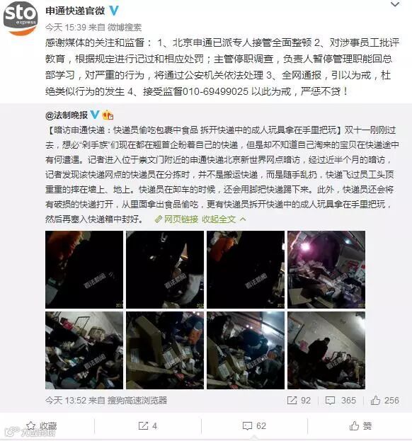 事件曝光后,申通迅速做出回应,表示: