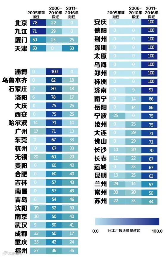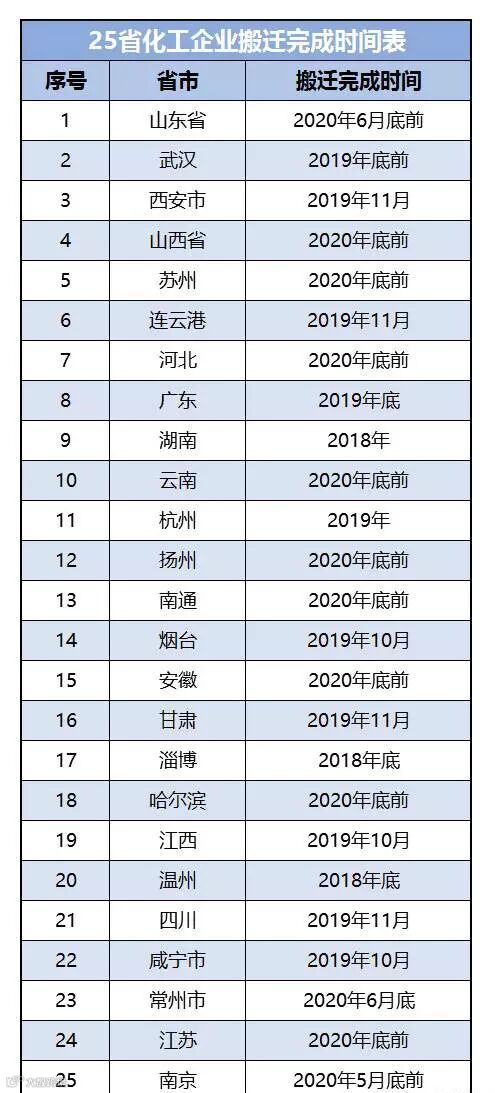 到2020年现有位于城镇内人口密集区域的危化品生产企业全部启动搬迁改造。截止到2016年底,已经有48个省市参与了这次史上规模最大的化工企业大搬家。
