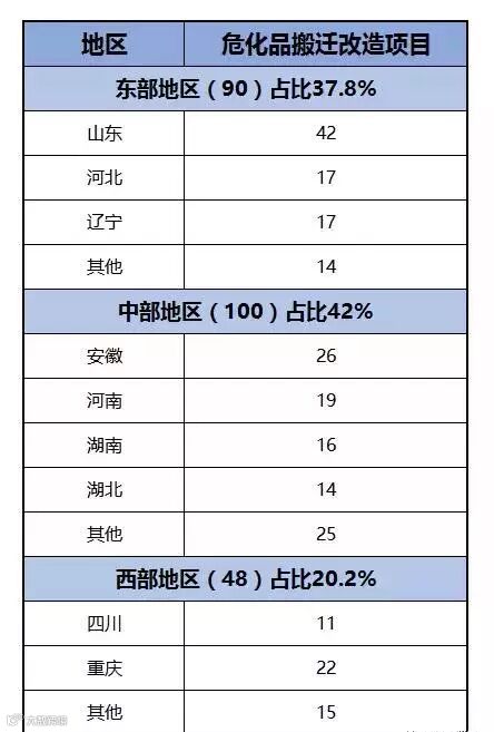 据了解,工信部、国家发改委等遴选出的238个危化品搬迁改造项目,按区域划分,东部地区有90个,占项目总数的37.8%,中部地区有100个,占项目总数的42%;西部地区有48个,占项目总数的20.2%。