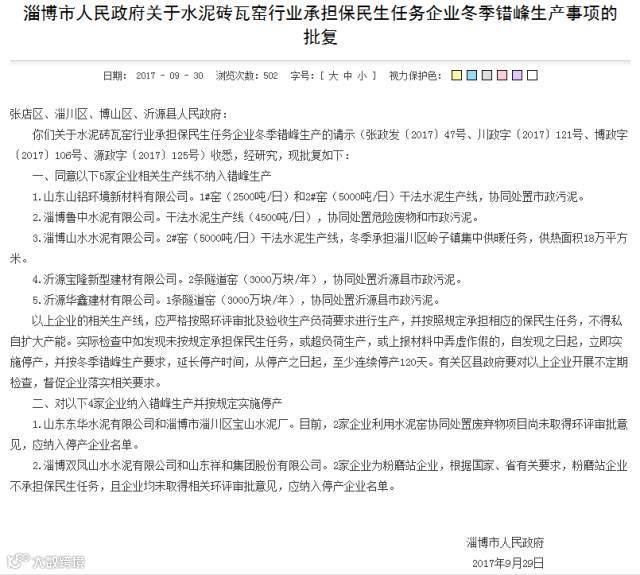 附:2017年9月29日淄博市人民政府下发通知,同意5家企业相关生产线不纳入错峰生产,4家企业纳入错峰生产并按规定实施停产。