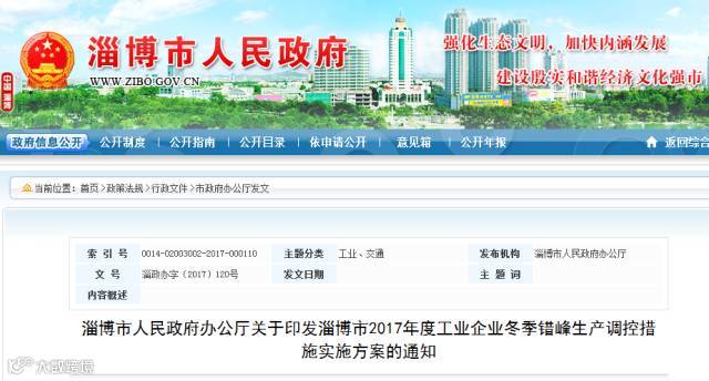 淄博市人民政府办公厅关于印发淄博市2017年度工业企业冬季错峰生产调控措施实施方案的通知